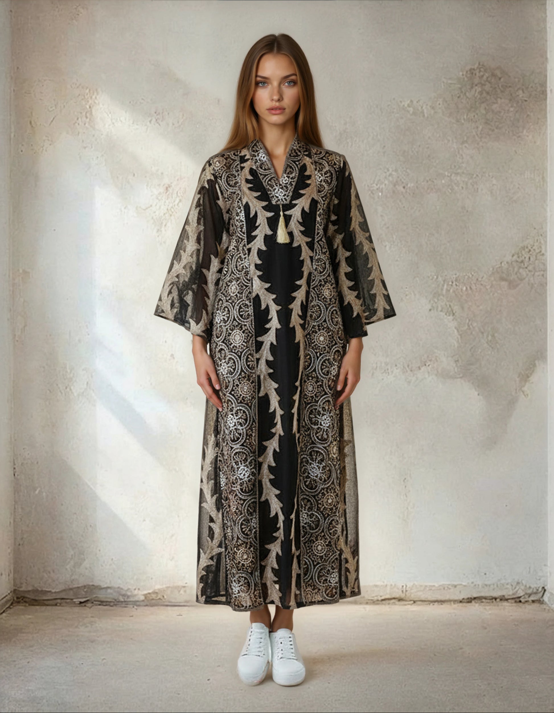 Crafted from premium-quality fabric, this jalabiya ensures a soft, breathable, and lightweight feel against the skin, allowing effortless movement throughout the day. The intricate embroidery across the chest and sleeves reflects skilled craftsmanship and attention to detail, adding a touch of regal artistry to its classic design. The loose, airy fit complements all body shapes gracefully, while the modest neckline and long sleeves enhance its elegant charm. Whether paired with subtle accessories or worn as a statement piece, it radiates sophistication and cultural authenticity.