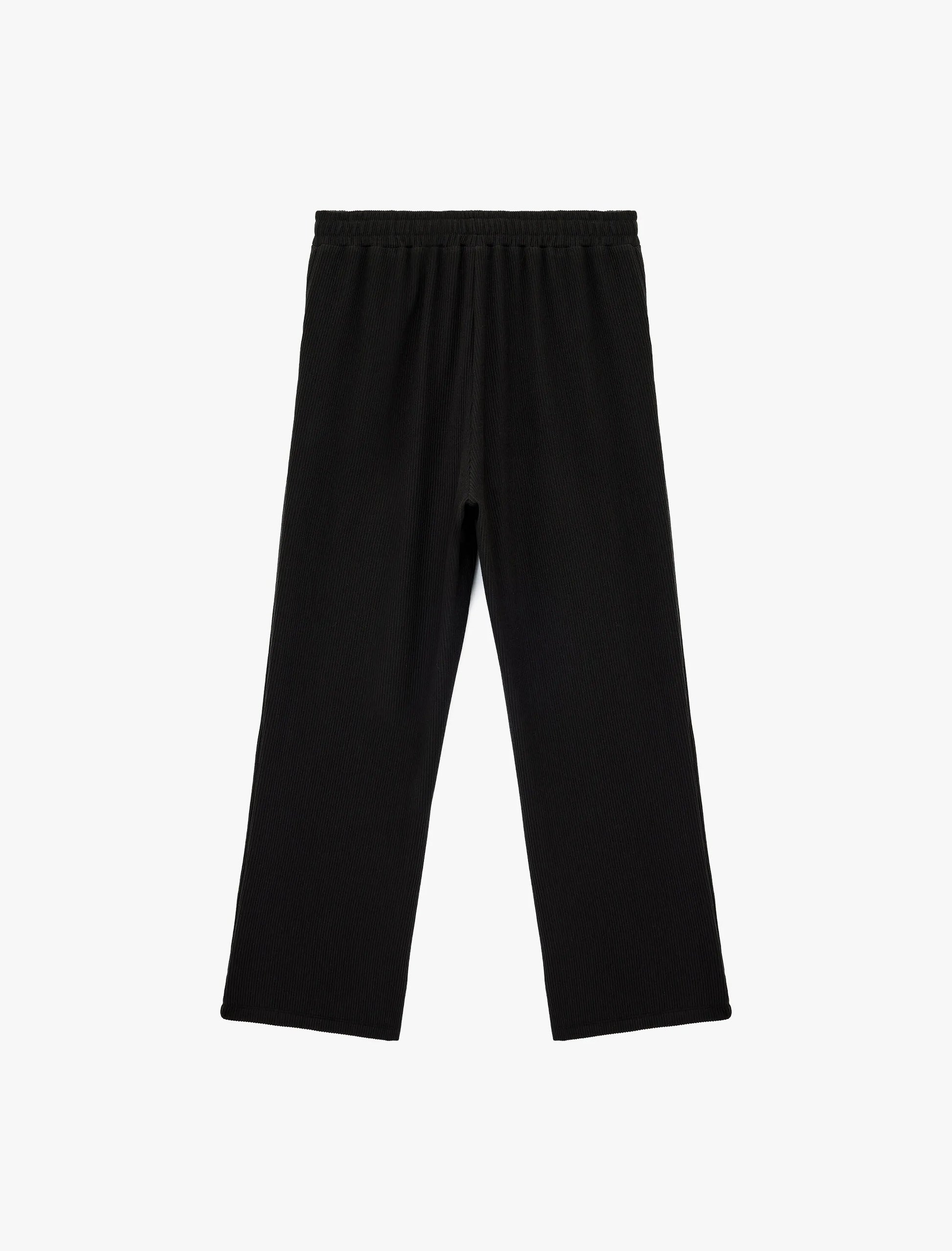 These sweatpants are crafted from high-quality cotton fabric, ensuring maximum breathability and comfort for all-day wear. The ribbed texture design adds a unique and fashionable element, setting them apart from standard sweatpants. The elastic waistband with drawstring closure offers adjustability, providing a customized fit for every body type. Additionally, their tapered silhouette balances a relaxed yet structured look, making them versatile enough for both casual outings and indoor relaxation. Designed in a timeless black shade, these sweatpants easily match with any top, hoodie, or jacket in your collection.