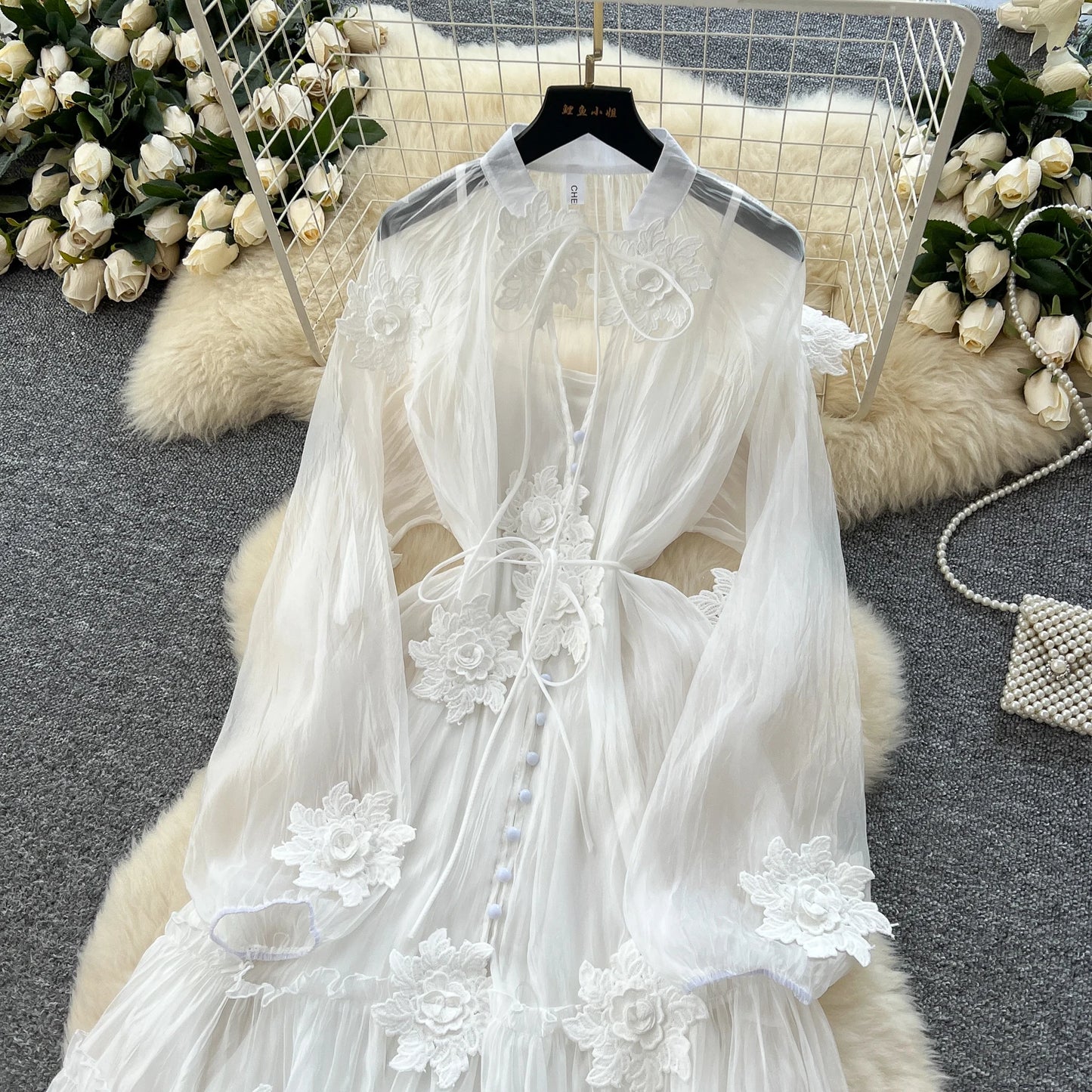 Elegant Floral Embroidery Sash Tie Chiffon Dress
