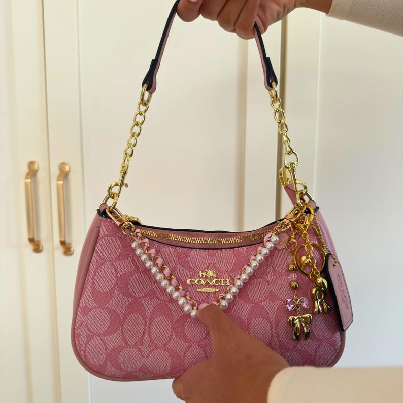 Vintage Luxury Pink Handbag with Pearls and Charms
