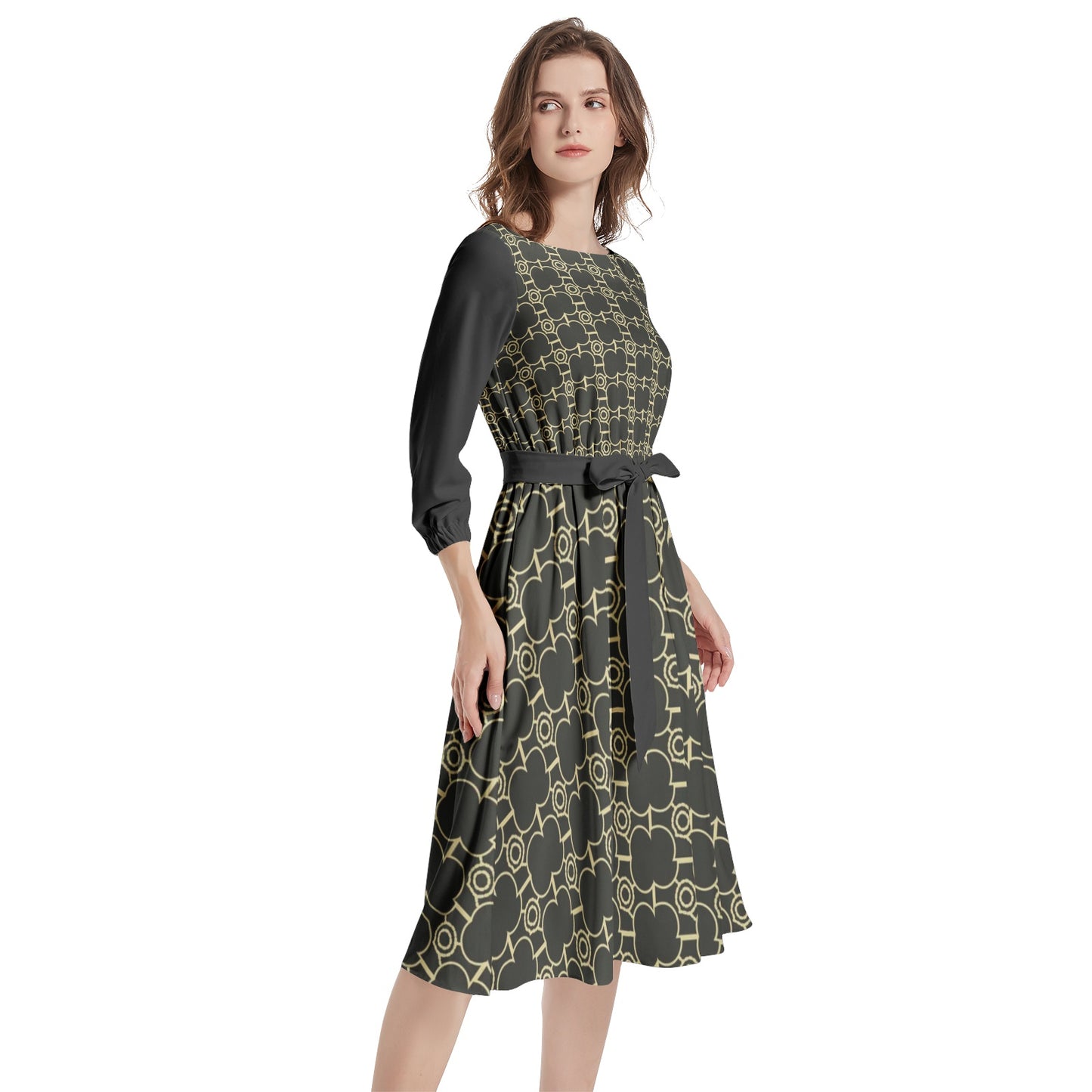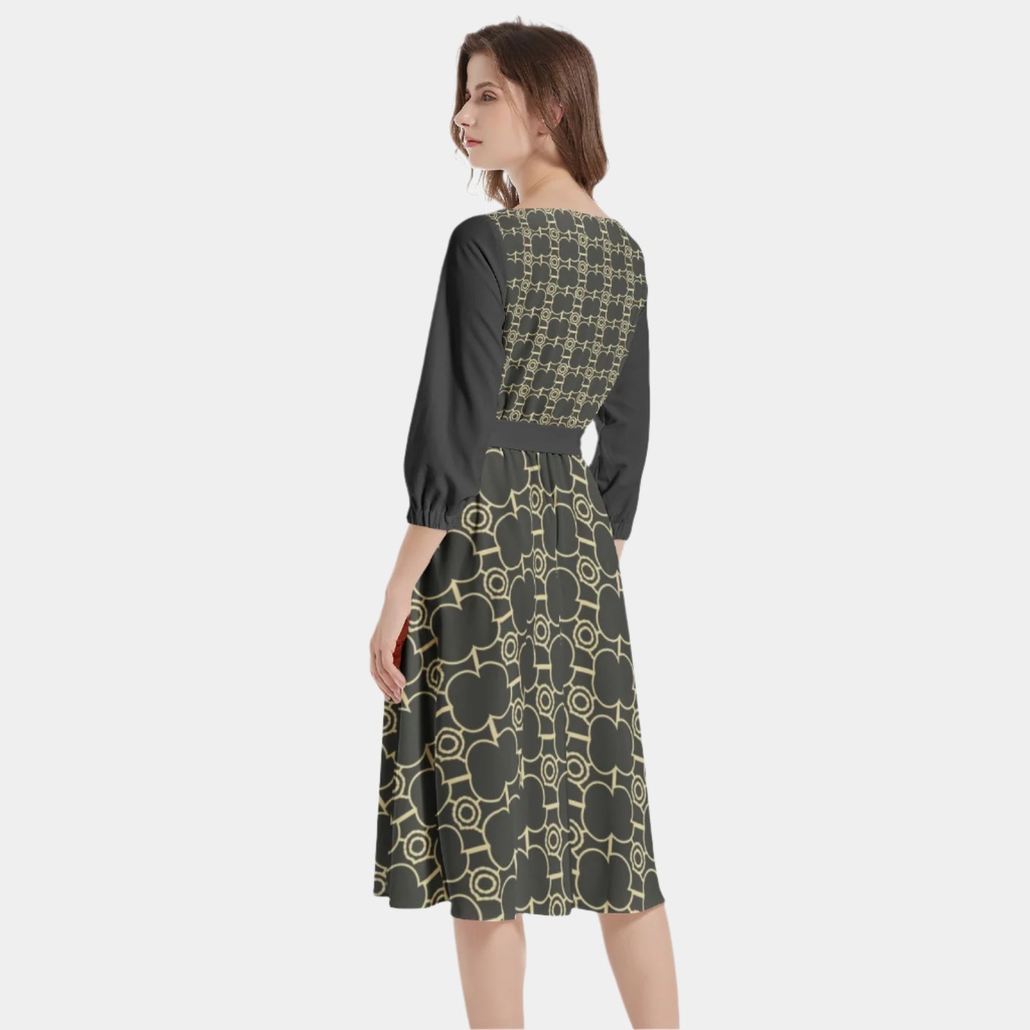 Manga farol 3/4, cintura fruncida, bajo acampanado, dos bolsillos interiores, elegante vestido midi para mujer