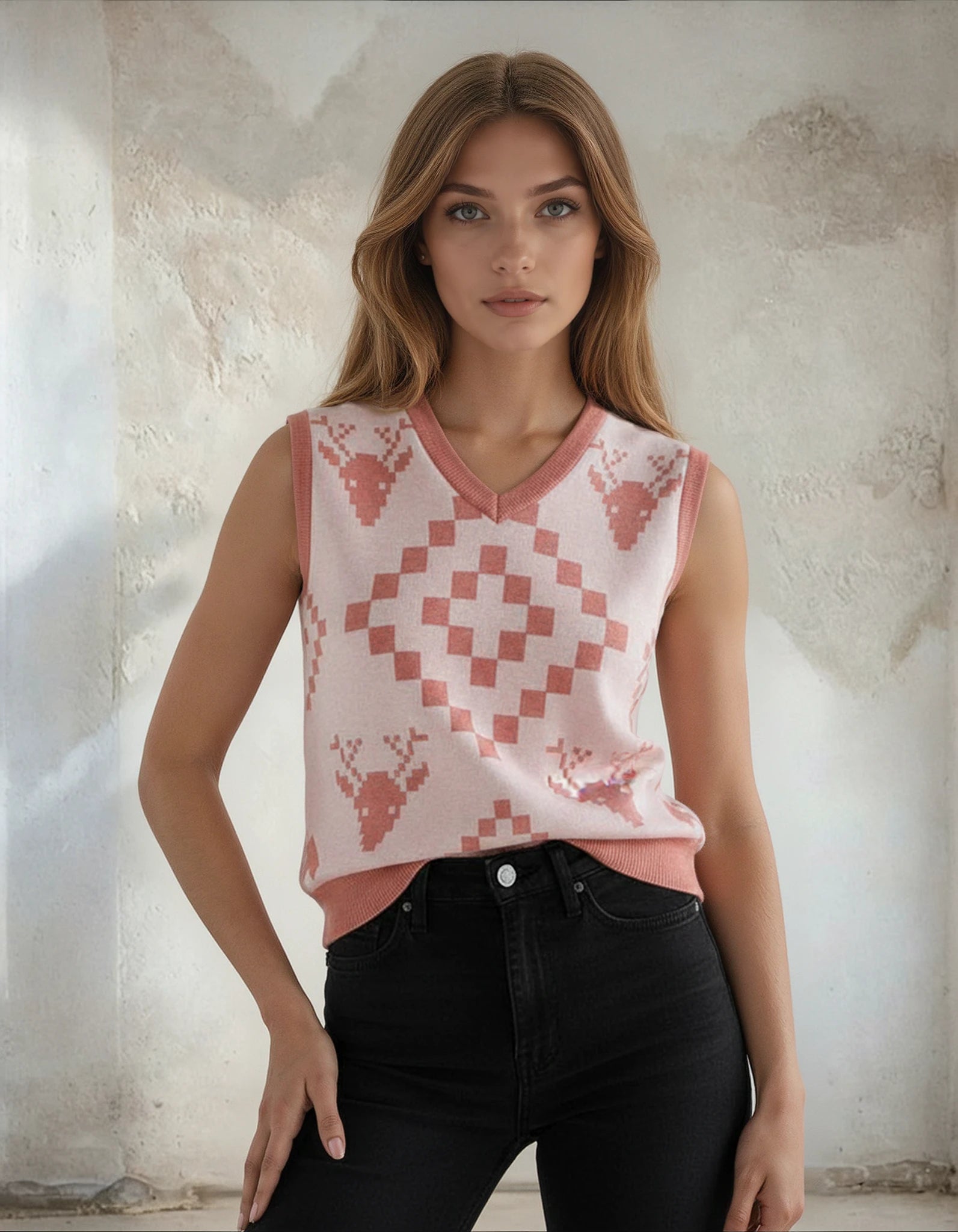 Classic Vintage V-neck Baby Pink Women Knitted vest