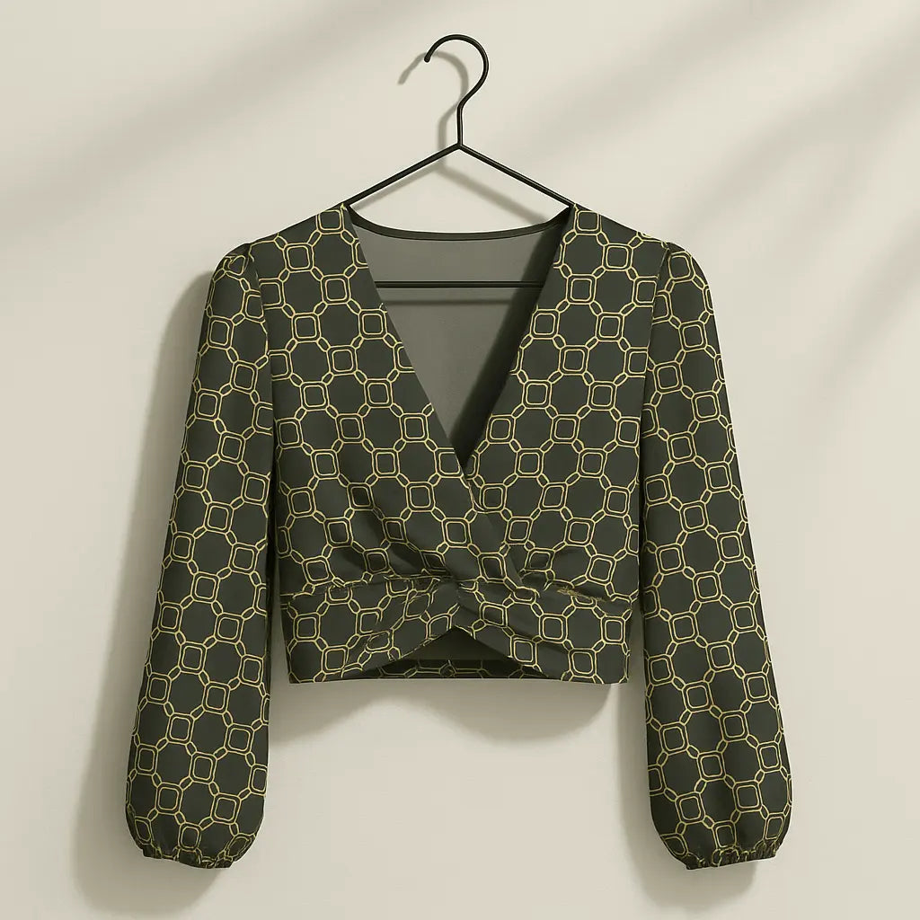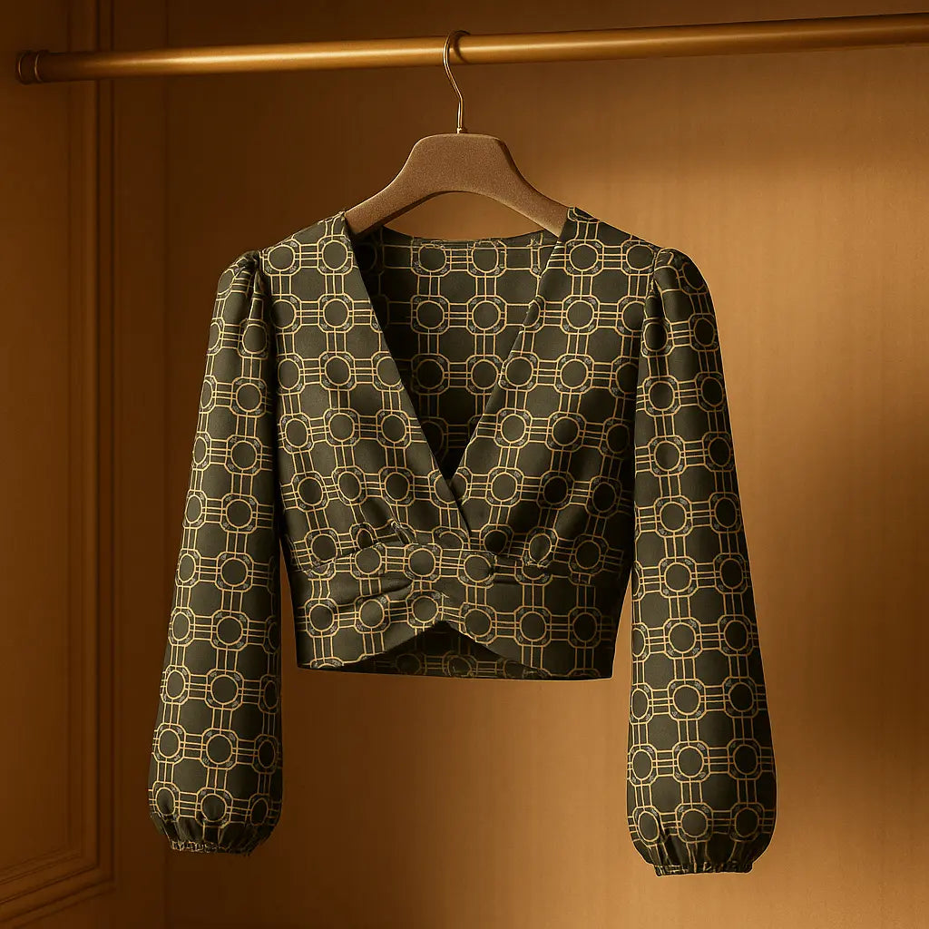The lantern sleeves bring volume and movement to the top, creating a romantic and contemporary feel. Their dramatic shape contrasts beautifully with the fitted crop design, delivering a balanced silhouette that flatters all body types.