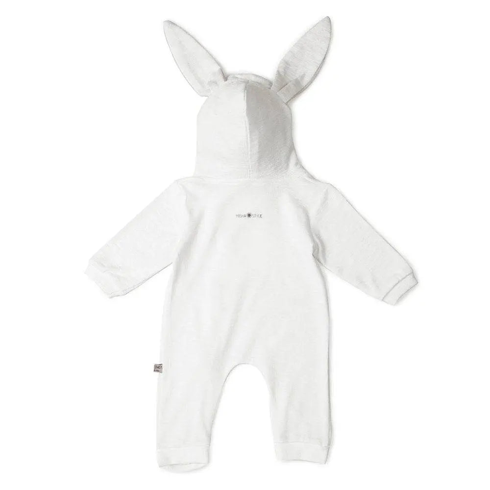 It's a solid color hoodie outfit with long sleeves and cute long 3D bunny ears. The zipper is extended to the full length of this suit.