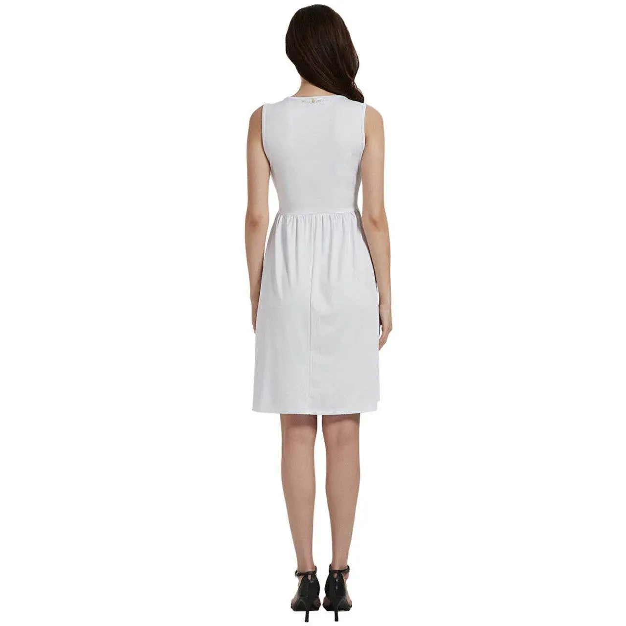 Crafted from a premium-quality, breathable fabric, the dress offers all-day comfort and structure. The standout detail lies in its gold button embellishments, arranged to provide visual interest and a luxe finish. The sleeveless cut is complemented by a fitted bodice and tailored waistline, enhancing your natural curves while maintaining a classy, minimalist style. Adding a practical touch, side pockets are seamlessly integrated into the design — ideal for keeping small essentials close at hand. The white tone further elevates the piece, making it a versatile canvas for accessorizing or layering.