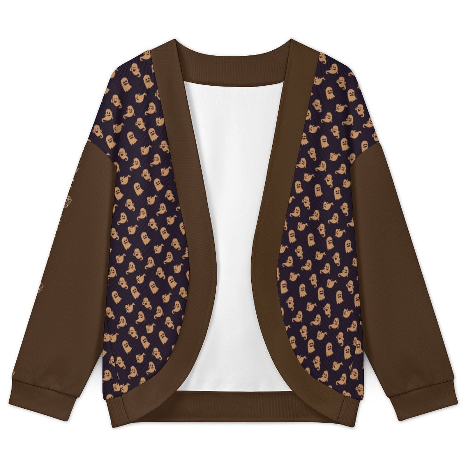 Crafted from premium, breathable knit material, this cardigan offers lasting comfort without compromising on style. The drop-shoulder design creates a loose, effortless fit that flatters all body types and allows for easy layering. Adorned with adorable ghost motifs, it adds a fun, festive twist to your everyday look. The open front style ensures easy wear, while ribbed cuffs and hemline provide structure and durability. Versatile enough for indoor lounging or outdoor strolls, this cardigan seamlessly blends seasonal flair with cozy elegance.