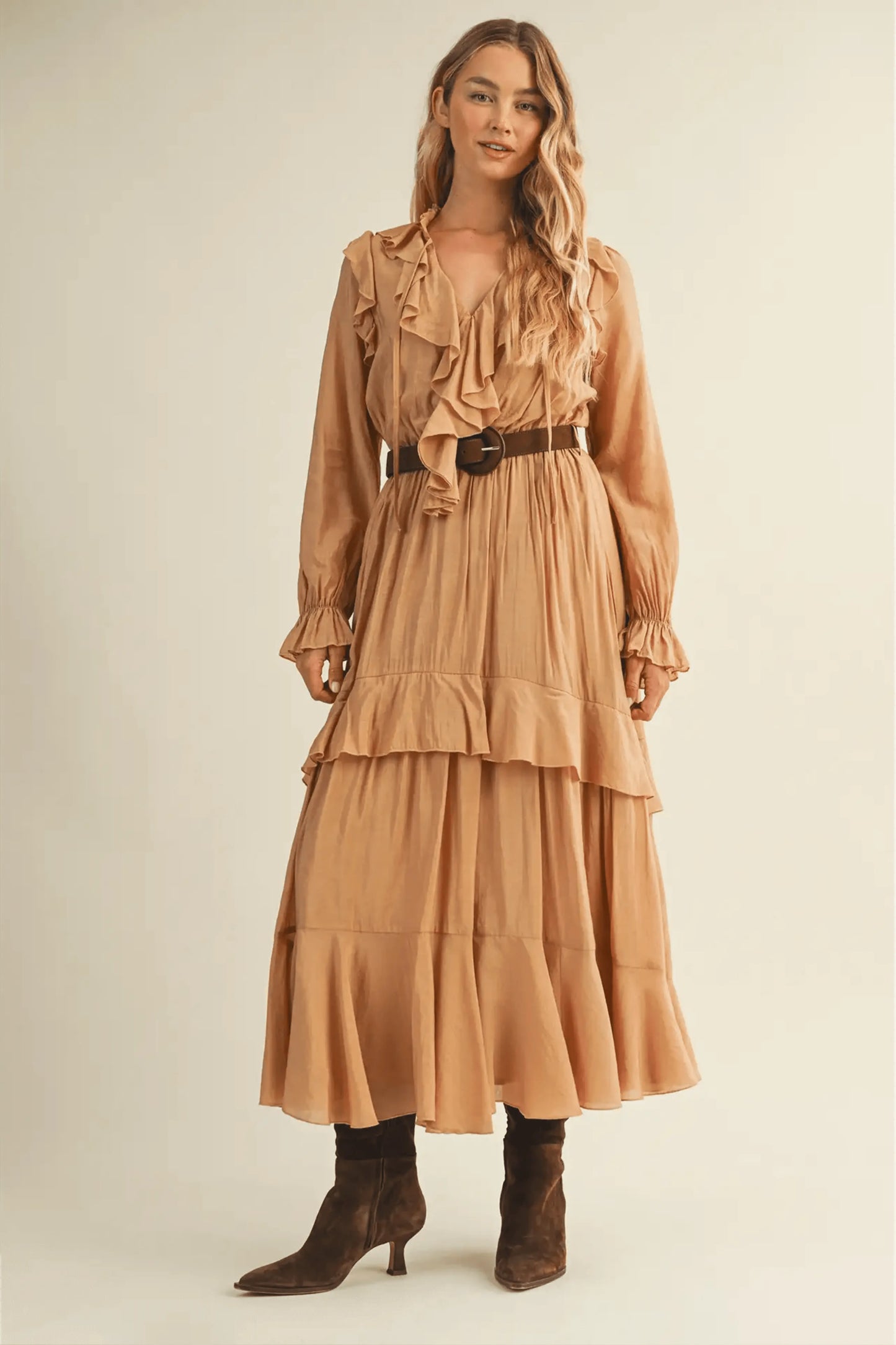 Choose the Luxury Belted Ruffled Long Desert Dress for a combination of elegance, comfort, and versatility. Its sophisticated design, flattering fit, and luxurious materials make it a timeless wardrobe staple that effortlessly elevates any occasion.