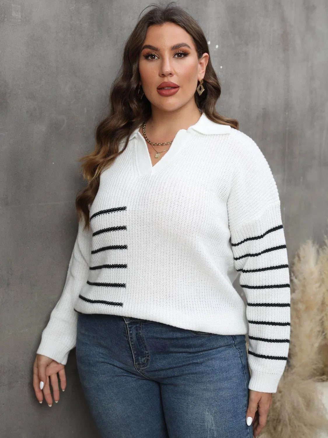 Upgrade your wardrobe with the Plus Size Striped V-Neck Sweater, the ultimate blend of fashion, function, and comfort for every occasion.