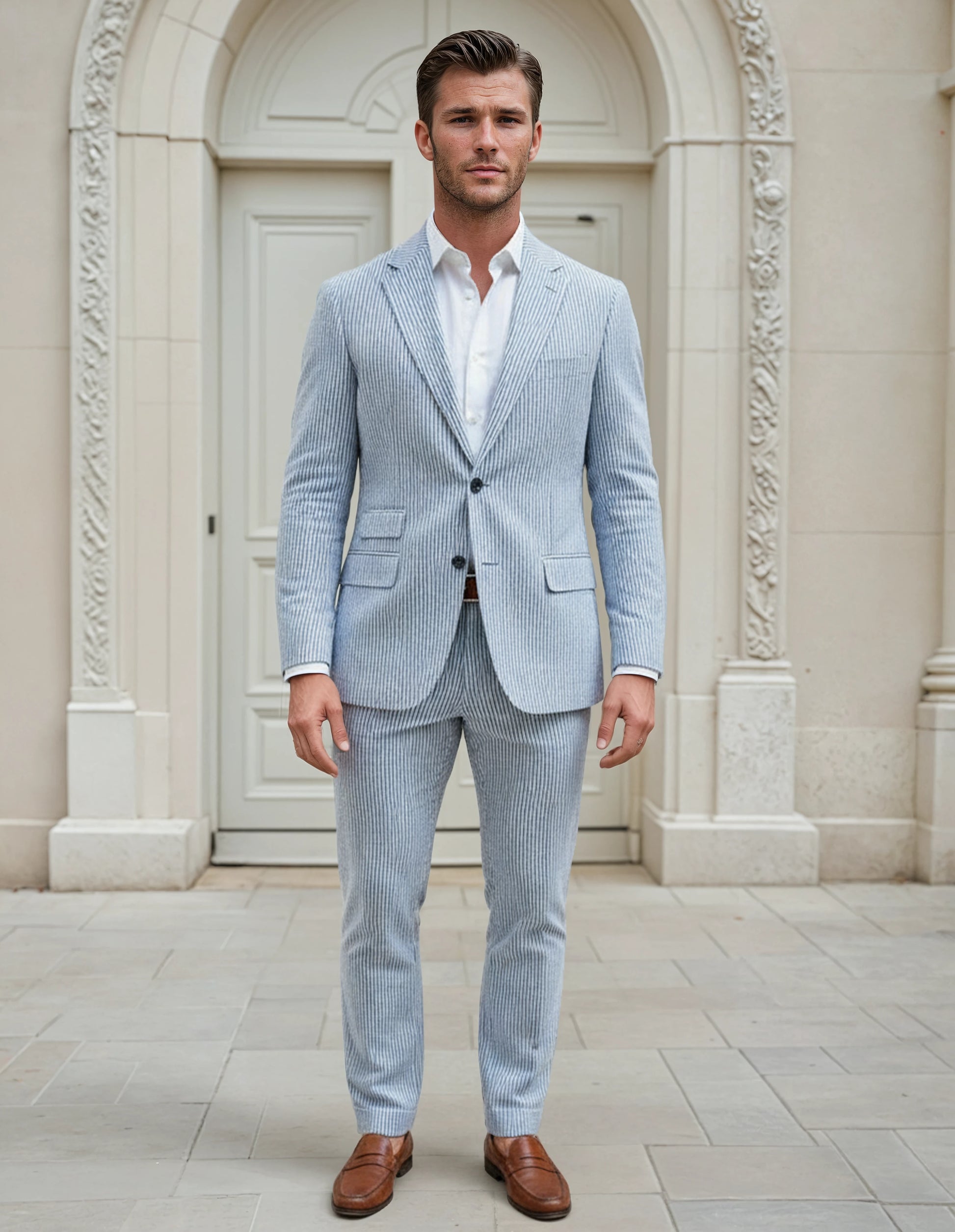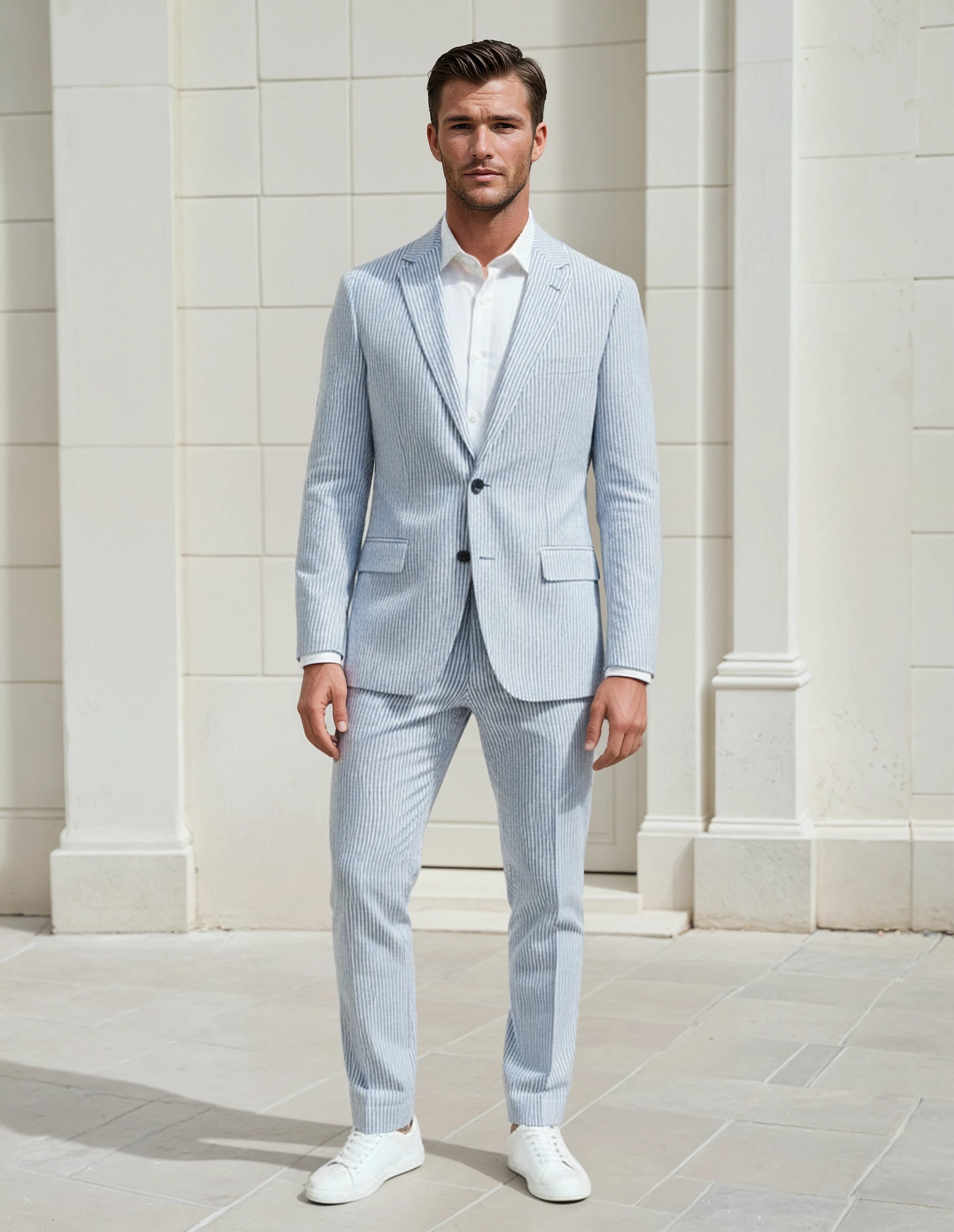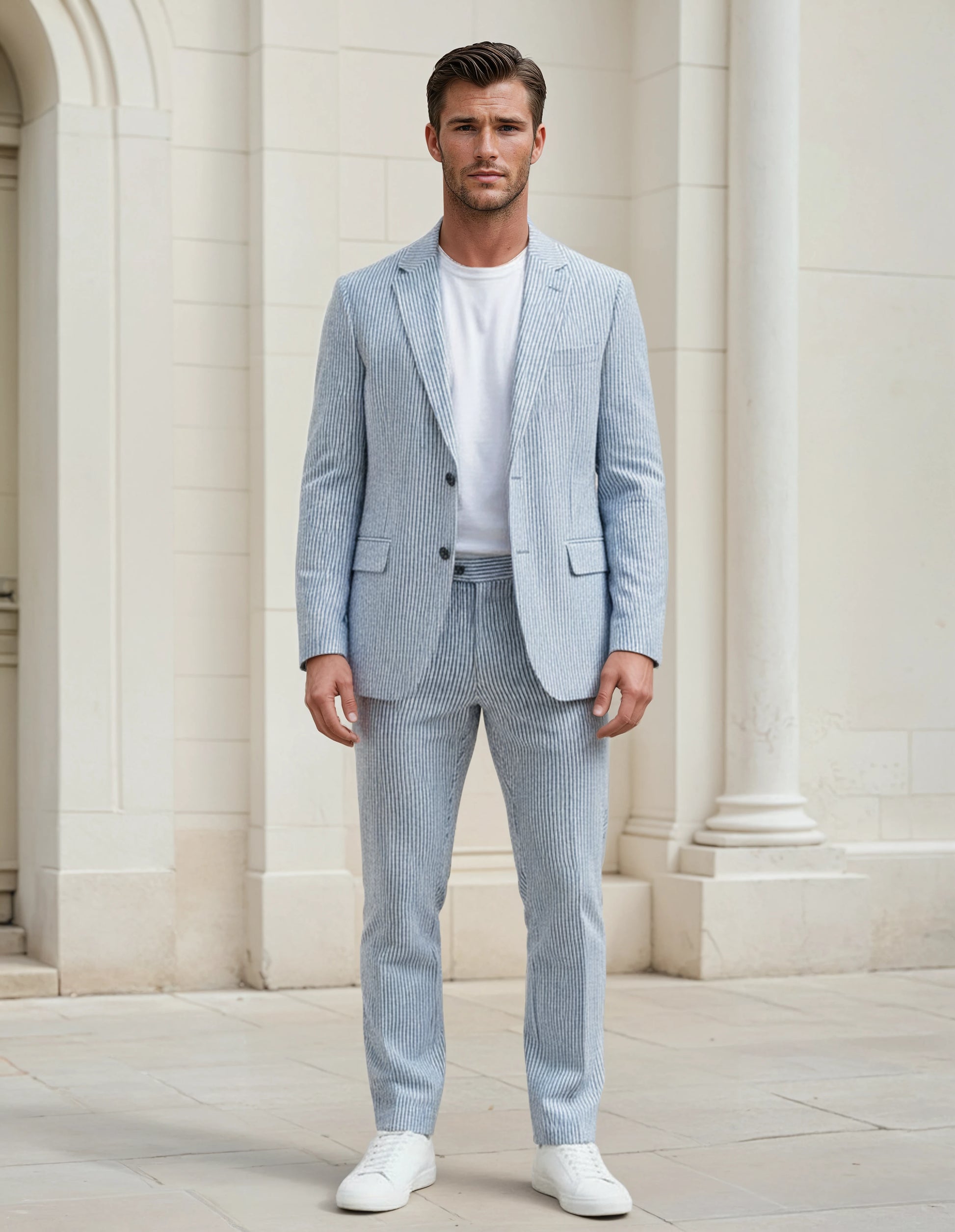 Another standout feature of this suit is its lightweight and wrinkle-resistant material, which ensures a crisp and clean appearance throughout the day. The subtle texture of seersucker fabric adds depth and sophistication without being overly formal, allowing it to work effortlessly in both business and social settings. Its versatility makes it suitable for office wear, weddings, garden parties, or evening events, giving it a unique advantage over traditional suits.